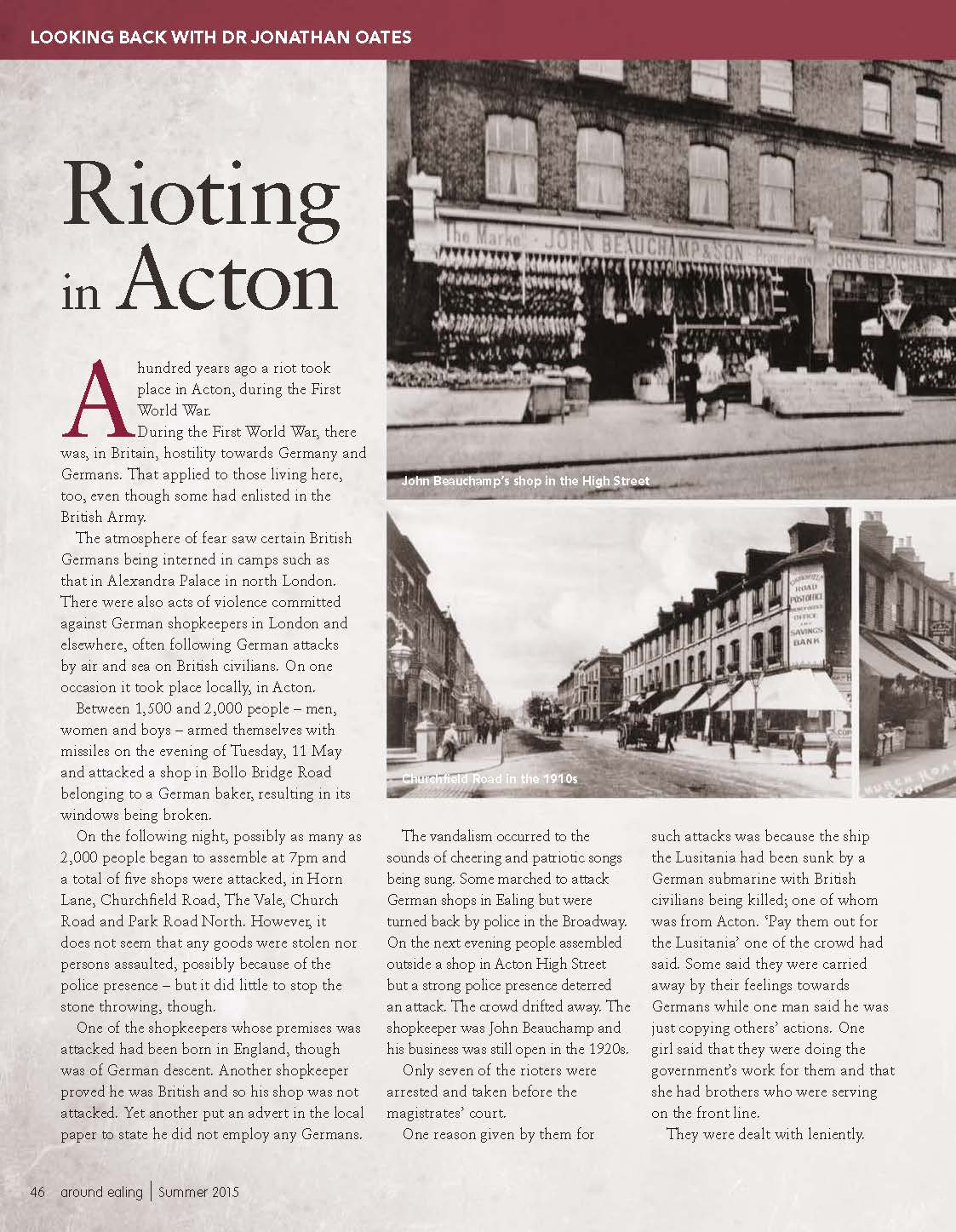On the next evening people assembled outside a shop in Acton High Street but a strong police presence deterred an attack. The crowd drifted away. The shopkeeper was John Beauchamp and his business was still open in the 1920s.