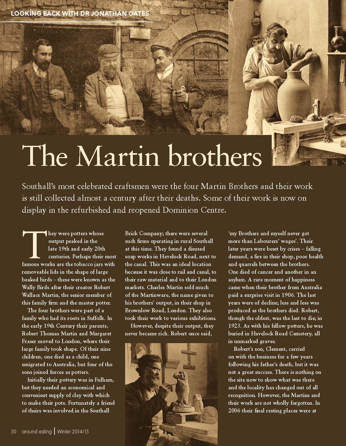 Southall’s most celebrated craftsmen were the four Martin Brothers and their work is still collected almost a century after their deaths. Some of their work is now on display in the refurbished and reopened Dominion Centre.
